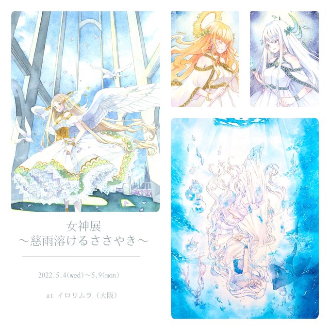 【展示のお知らせ】 女神展〜慈雨溶けるささやき〜 (@1000_emblems ) ■2022.5.4~5.9 ■イロリムラ(大阪) 額装作品4点、ドローイング3点(増えるかも)にて参加致します。 女神と浄化がテーマの展示会です。 GWお出かけのご予定がある方は是非ご高覧下さい。 #慈雨溶けるささやき