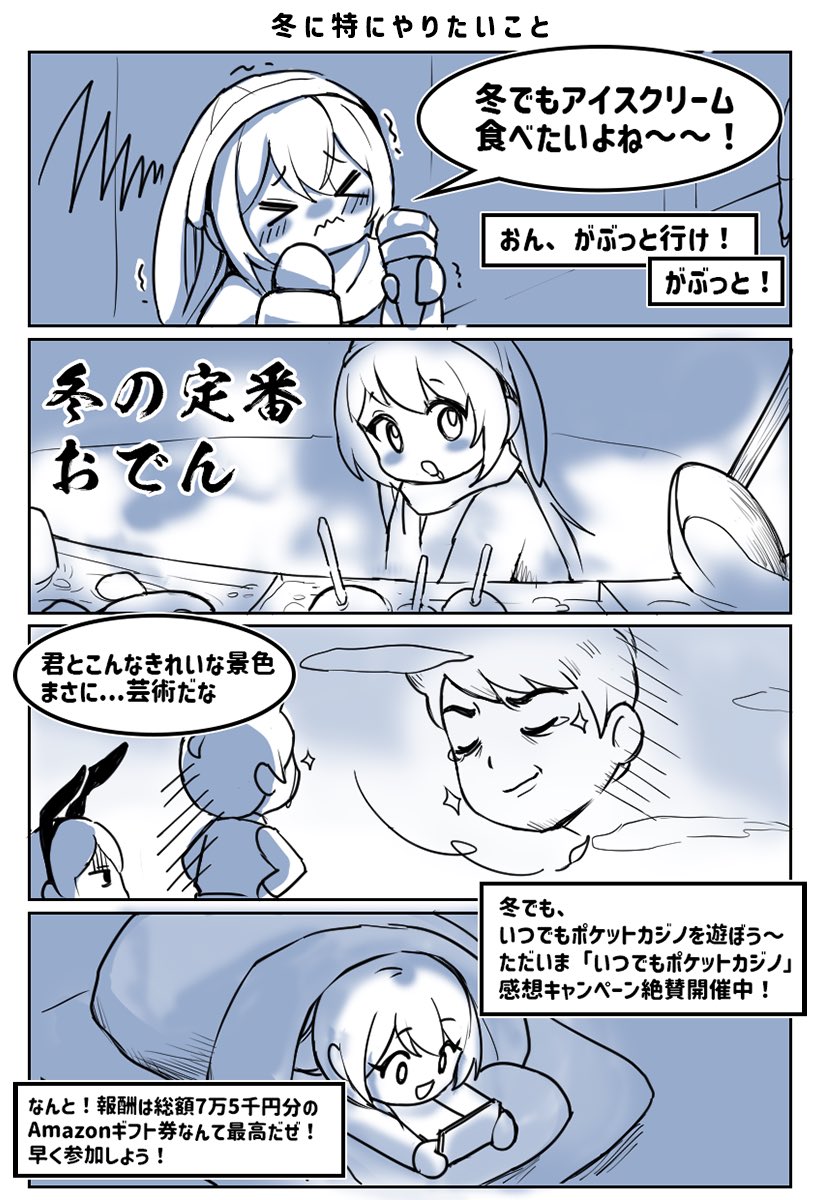 第十回「冬に特にやりたいこと」 レイン君は冬によく意味不明の発言をするようです。 #漫画が読めるハッシュタグ #漫画好きと繋がりたい #四コマ漫画 #冬 #がぶっと #いつでもポケットカジノ #懸賞 #懸賞好きさんと繋がりたい #アマギフ #期間限定