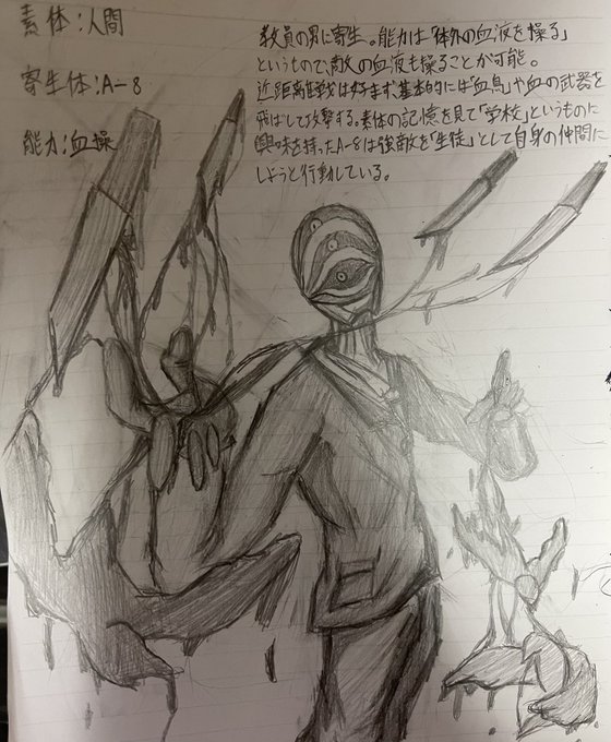 前回の投稿にチラッと登場した「A-8」の紹介です。 「生徒」になった相手は「授業」という名の洗脳を受け、逃げ出した生徒は「除名」という名目で殺害されるようです。 生徒は血液の貯蔵庫として利用され、人数は36人程度いるのだとか。 #我らがヴィランアカデミア #イラスト #アナログイラスト