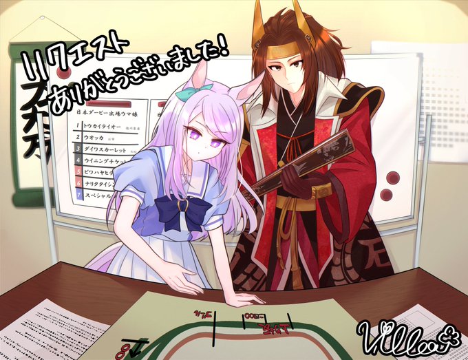 skebでリクエストいただいた、マックイーンと戦国無双2の石田三成のレースの作戦会議の様子です!元ネタのダービー無双見てみたのですが面白かったので描いいて楽しかったです✨ありがとうございました! #ウマ娘 #メジロマックイーン #戦国無双2