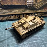タミヤ 1/48MM 3号突撃砲G型。先月末にサンドイエロー塗装までやったので、今日はウェザリングして完成。オキサイドレッドの上に筆塗りで塗ったのが失敗。今度はスプレーにしよう。しかし1/48は3号以下だと小さすぎて目がしんどいなー(老眼)。 #タミヤ #今月作ったプラモ晒そうぜ #戦車模型
