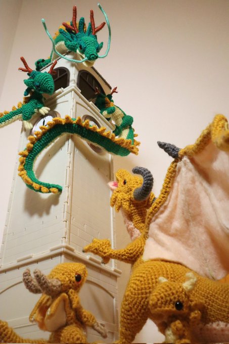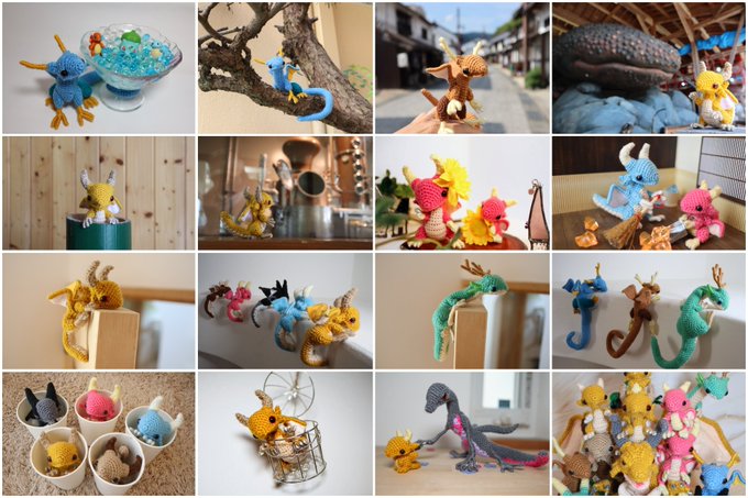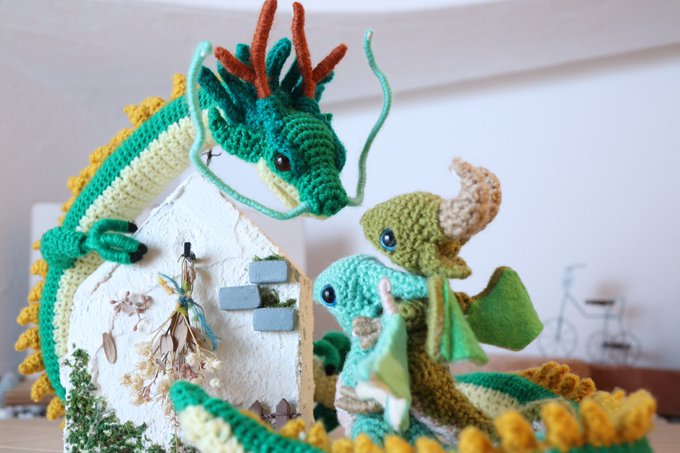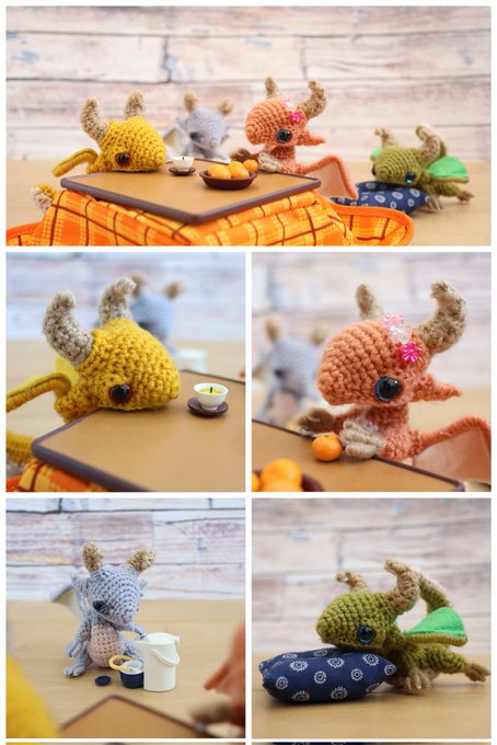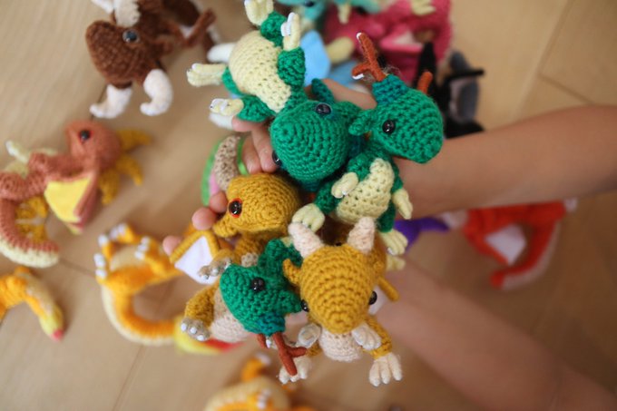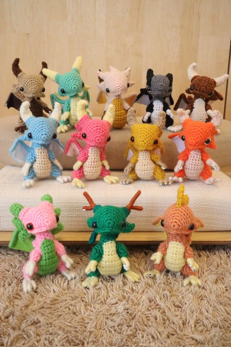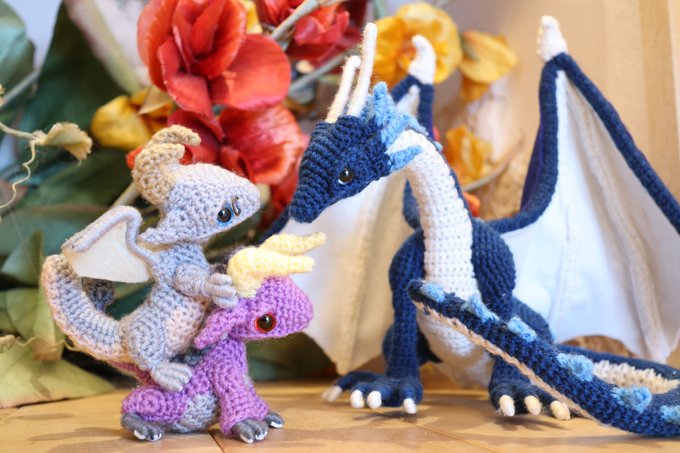#2021SNS秋の芸術祭 あみぐるみのドラゴンを作ってます #手乗りドラゴンの日常 タグの最新から辿ってもらえれば、ドラゴン達のほっこり日常の写真が100枚以上イッキ見できます お暇なときにでも見てみてください