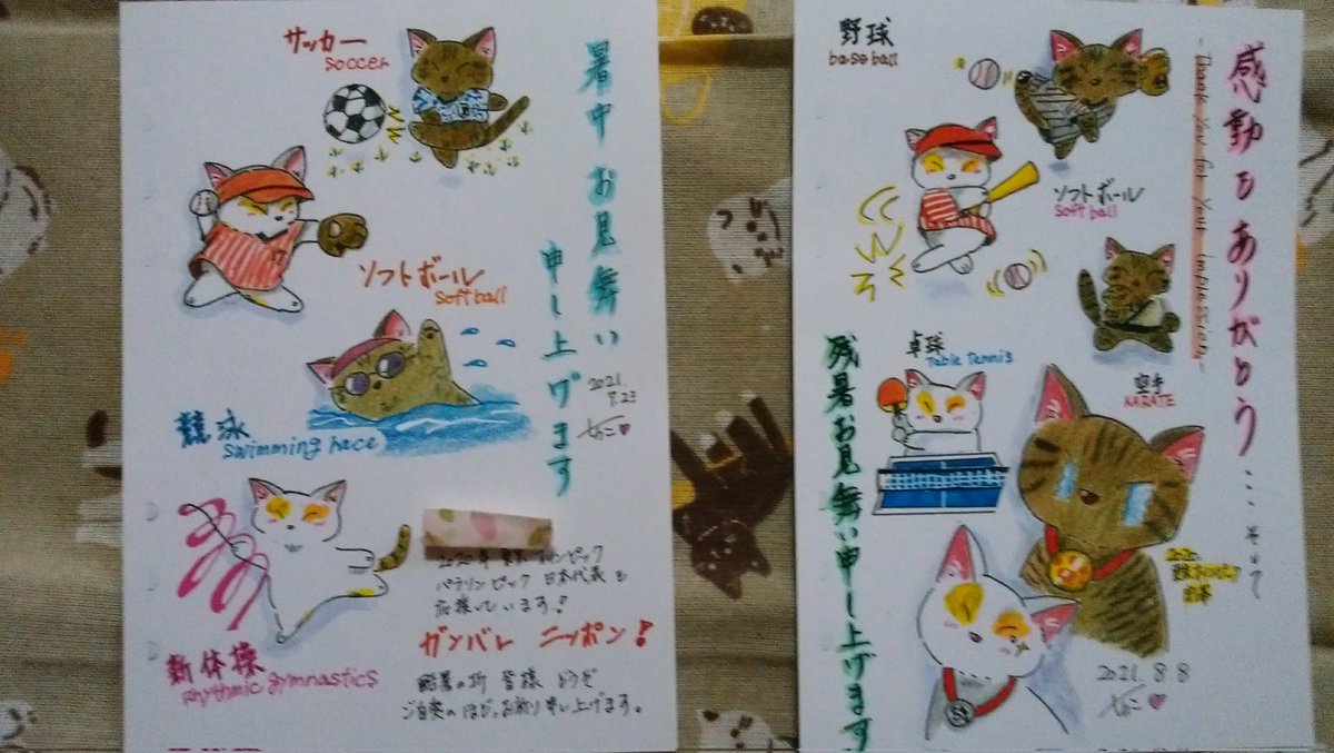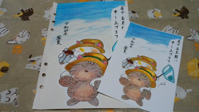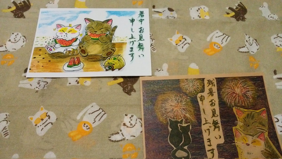 こんばんは。先日描いた暑中見舞いの #イラスト をハガキサイズに印刷してお世話になっている方に配ってきました。ちなみに後の四枚は去年描いた暑中見舞いと残暑見舞いの #手描きポストカード です。今年と比べていかがでしょうか? #徒然補完計画