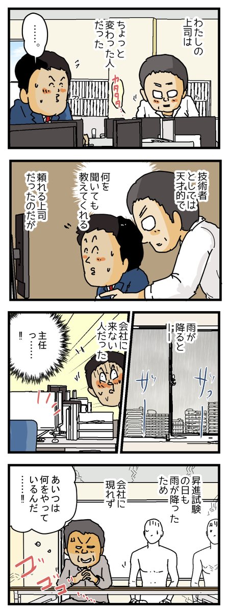 【雨が降ると会社に来ない上司】に、思い切って理由を聞いてみた、、 #コミックエッセイ #投稿エピソード #漫画が読めるハッシュタグ ブログはこちら↓ ameblo.jp/yukitanoyonkom…