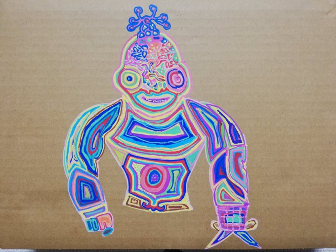 中2息子の #創作画 30分の即興で ダンボールに 描いた作品です🥰 今月もよろしくお願いします(*ᴗˬᴗ)⁾⁾ #抽象画 #みんなで楽しむTwitter展覧会 #アナログ #美術ネットワーク #絵描きさんと繋がりたい #秋の創作クラスタフォロー祭り #drawing #artwork #ArtistOnTwitter #art #ペン画
