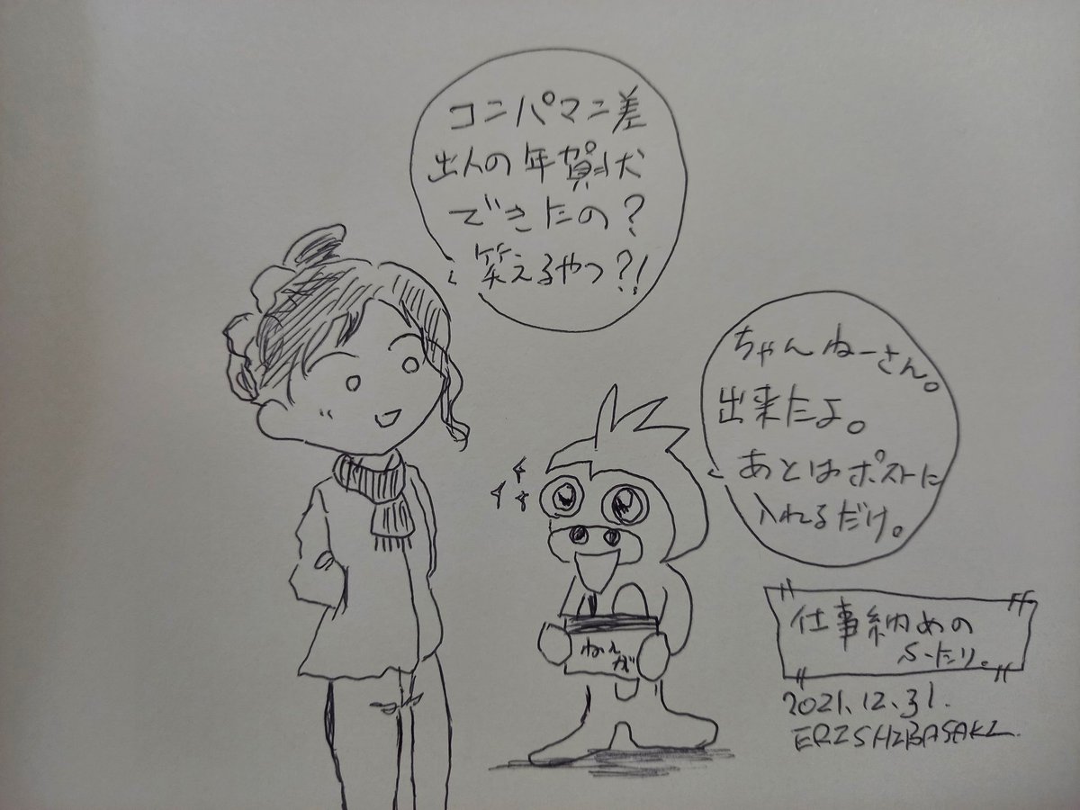 「仕事納めのふたり」 おさるさんと担当ちゃんねーが、2021年の仕事納めをしました。 コンパマンに年賀状書きをやらされていたおさるさん。 おさるさんは、年賀状の反応が楽しみで仕方がない。 #おさるさん #担当ちゃんねー #激務労働 #絵描きさんと繋がりたい #絵師さんと繋がりたい #仕事納め