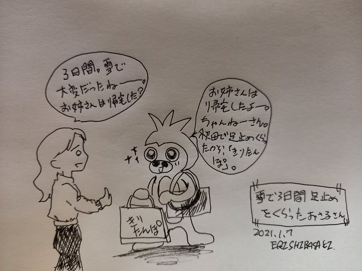 「雪で足止めをくらったおさるさん」 おさるさんは、お正月休みをお姉さんとスキーに行ってたのだが、帰宅時に雪で三日間足止めをくらった。 担当ちゃんねーに、きりたんぽを渡す。 #おさるさん #担当ちゃんねー #激務労働 #きりたんぽ #絵描きさんと繋がりたい #絵師さんと繋がりたい #大雪 #お姉さん