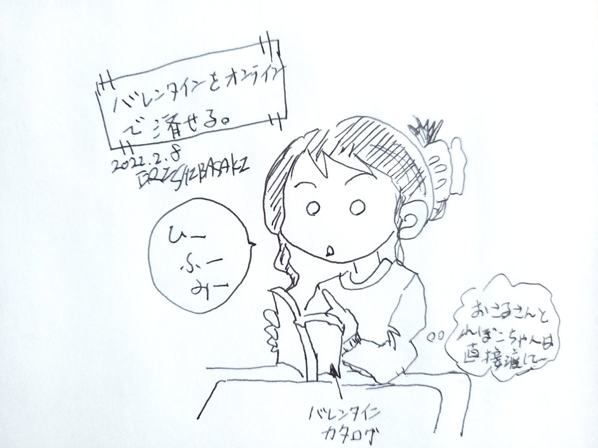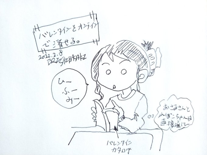 「バレンタインをオンラインで済ませる」 担当ちゃんねーがバレンタインカタログを見ながら、オンラインで送り先を決めてます。おさるさんとれぼこには、直接。渡すようです。 #バレンタイン #オンライン #直接渡し #担当ちゃんねー #激務労働 #絵描きさんと繋がりたい #絵師さんと繋がりたい