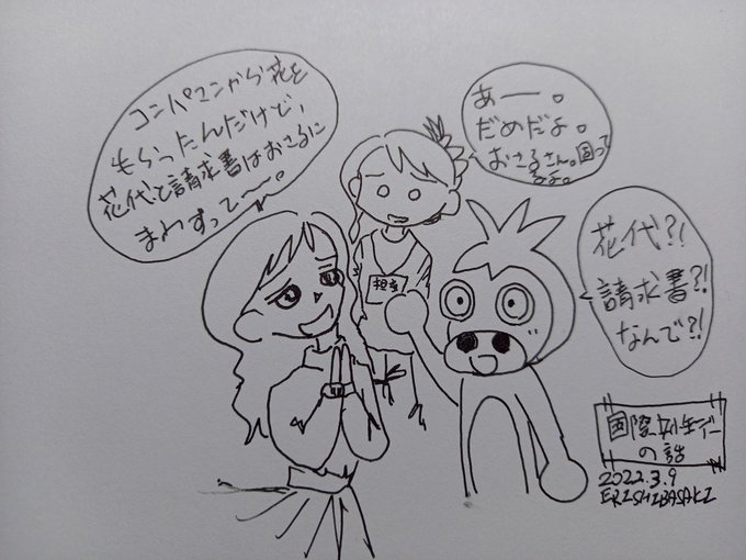 「国際女性デーの話」 世界女性デーといって、男性が女性にお花を送る習慣の日が昨日で、コンパマンからお花をもらった女性がおさるさんに「花代」と「請求書」をまわしといて!と言われて、おさるさん。固まる。#おさるさん #担当ちゃんねー #激務労働 #絵描きさんと繋がりたい #絵師さんと繋がりたい