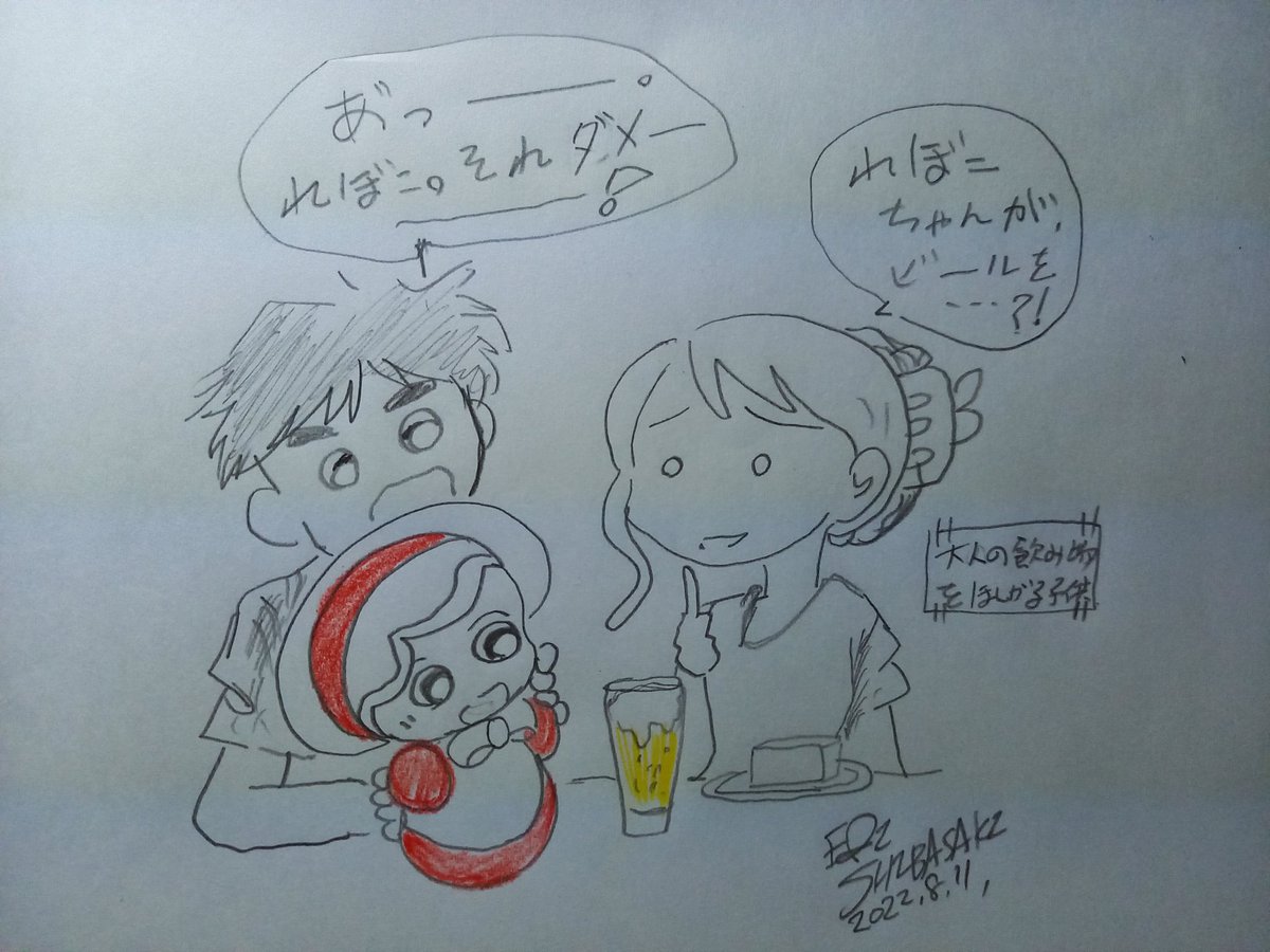 「大人の飲み物をほしがる子供」 子供の頃。大人が飲む飲み物を欲しがって、飲んだことがあるのですが、結果。「リンゴ病」になった私の思い出から描きました。 #れぼこ #担当ちゃんねー #みー君 #絵描きさんと繋がりたい #絵師さんと繋がりたい #ビール #大人の飲み物 #リンゴ病
