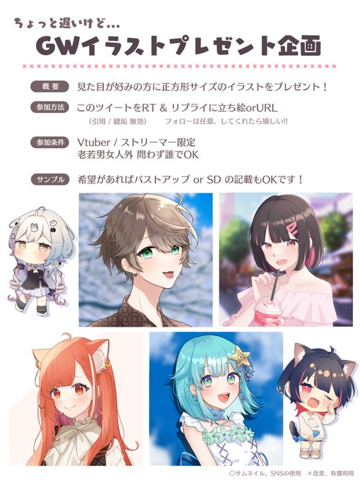 🌸GWイラストプレゼント企画🌸 今更感ありますがGW企画開催です✨ 期間、人数は定めていないので 満足したら締め切ります🙇♀️ 概要、参加方法等は画像をご確認ください🙏 皆様のご参加お待ちしております!! #RTしたVtuberさんを描く #イラスト企画 #拡散希望