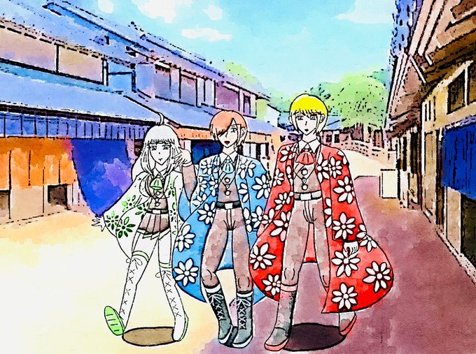 小説挿絵 如来町を散策する仏ナオト、月泉カノン、大和タケル 「仏法戦記アミーダ 如来万華鏡」第7話より #イラスト好きさんと繋がりたい #絵描きさんと繋がりたい #私の絵柄が好みって人にフォローされたい #拡散希望RTお願い致します