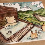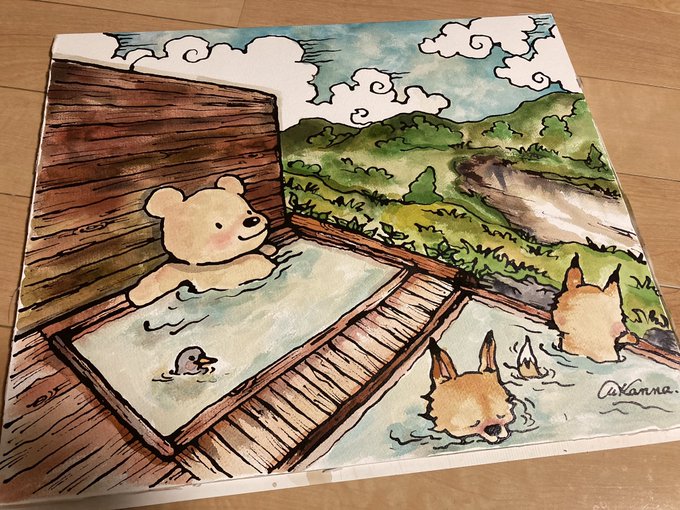 万座ホテルジュラク、色塗り完成‼︎ 明日はこの絵を持って3度目のワークショップ!楽しんで描きます! #スポイト画 #オリジナルイラスト #カラーインク #万座ホテルジュラク #指塗り #コーヒー #動物イラスト