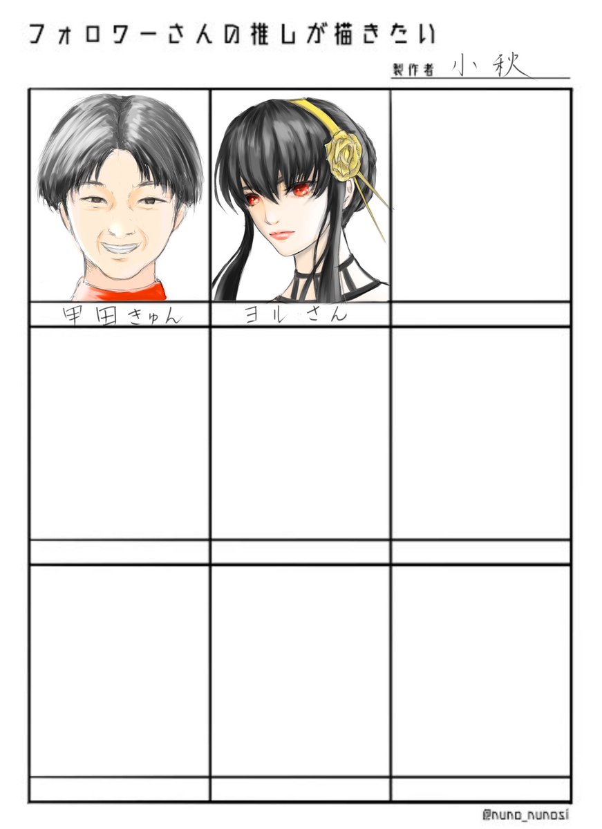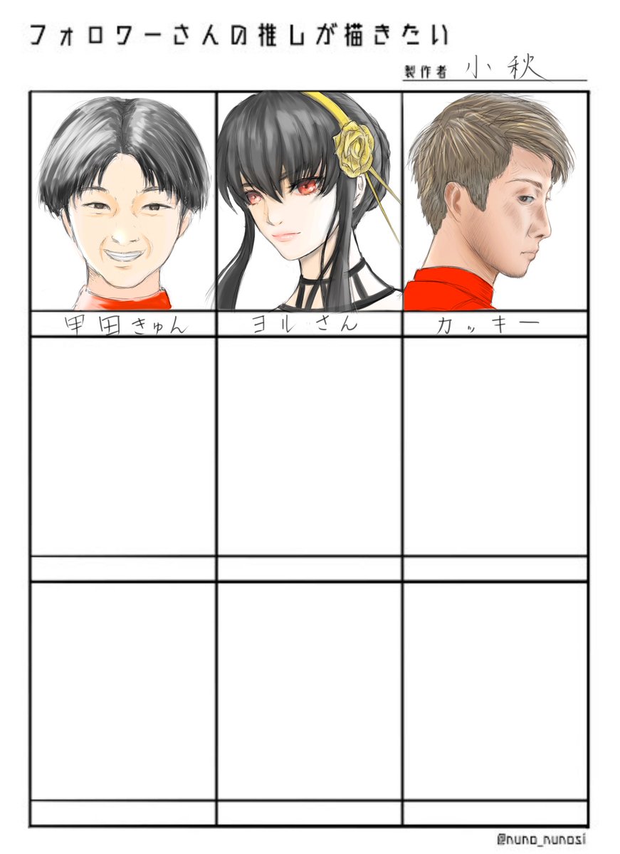 出張から帰るまで… #フォロワーさんの推しが描きたい #推しが描きたい ①甲田きゅん→✔︎ ②ヨルさん:スパイファミリー→✔︎ ③カッキー→✔︎ ④相馬きゅん ⑤グランパスファミリー 上手く描けたら青木きゅんと児玉きゅん。