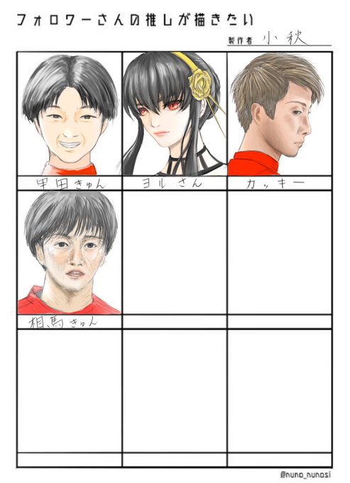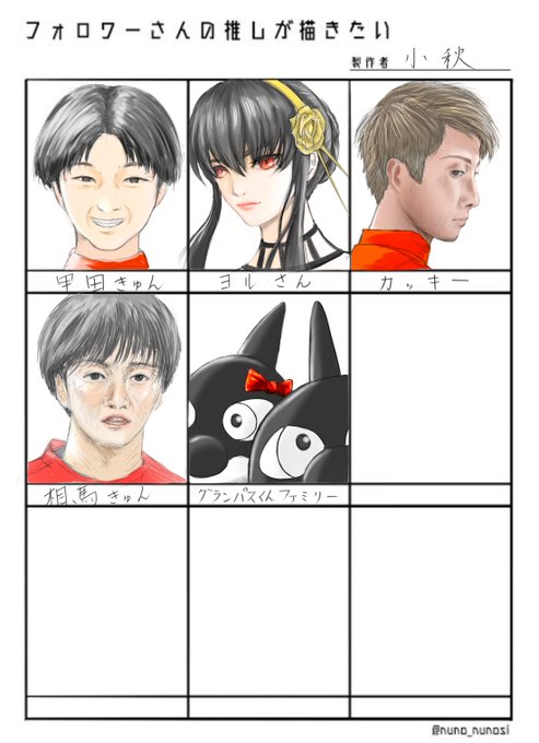 出張から帰るまで… #フォロワーさんの推しが描きたい #推しが描きたい あと少し ①甲田きゅん→✔︎ ②ヨルさん:スパイファミリー→✔︎ ③カッキー→✔︎ ④相馬きゅん✔︎ ⑤グランパスファミリー✔︎ ⑥ベッテル様 上手く描けたら青木きゅんと児玉きゅん。