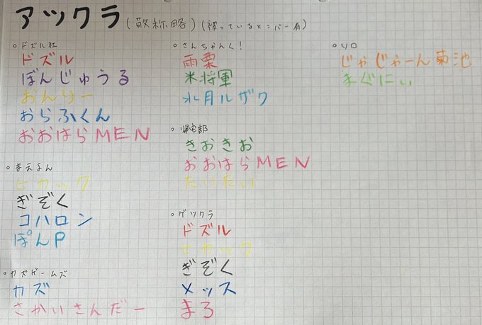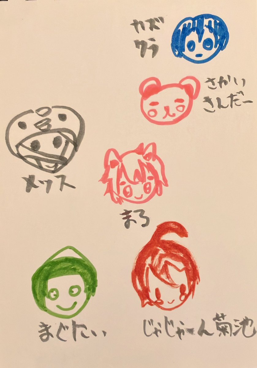 #アツクラ #ドズル社アート #ぼんさん何してんすか #はよ見ろやあ #誰でも見れますねぇ #見るかもわからん #きおきおオンライン #届けたいたい #カズ画 #描いたんだー #使ってぴくちゃんく #描いたよん #まろっち #メッス #じゃじゃの絵 #まぐ画 Youtubeのサムネや企画の色分けで判断しました