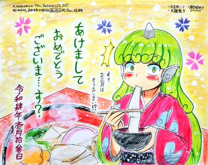 「え?もう2週間経っちゃったの!?」 博麗神社はまだまだお正月ムードでした⛩️ そんなわけであけおめワンドロ ことよろ"運転再開"致します🎍 #高麗野あうん #深夜の真剣お絵描き60分一本勝負 (東方版・1551回目参加) (※10月12日お題) #正月??? #お雑煮 #描き始め(ワンドロ)