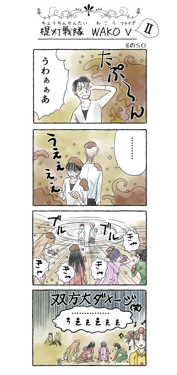 50話だよ!「提灯戦隊WAKO V」第二部その50! 絵ヅラ汚い・・・(;´・ω・) 第2部のこれまで twitter.com/i/events/13561… 第1部はこちらから twitter.com/i/events/12806… #提灯戦隊WAKOV #提灯 #連載漫画 #漫画 #戦隊 #四コマ #イラスト #埼玉県