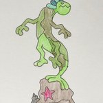 ワカメイグアナです。 ワカメの森に逃げ込んだ小魚を追ってきた大きい魚を捕まえる。 予想外のサイズが来てしまった時はしっかり擬態する。 #イラスト好きな人と繋がりたい #絵描きさんと繋がりたい #オリキャラ #ワカメ #イグアナ #擬態 #魚
