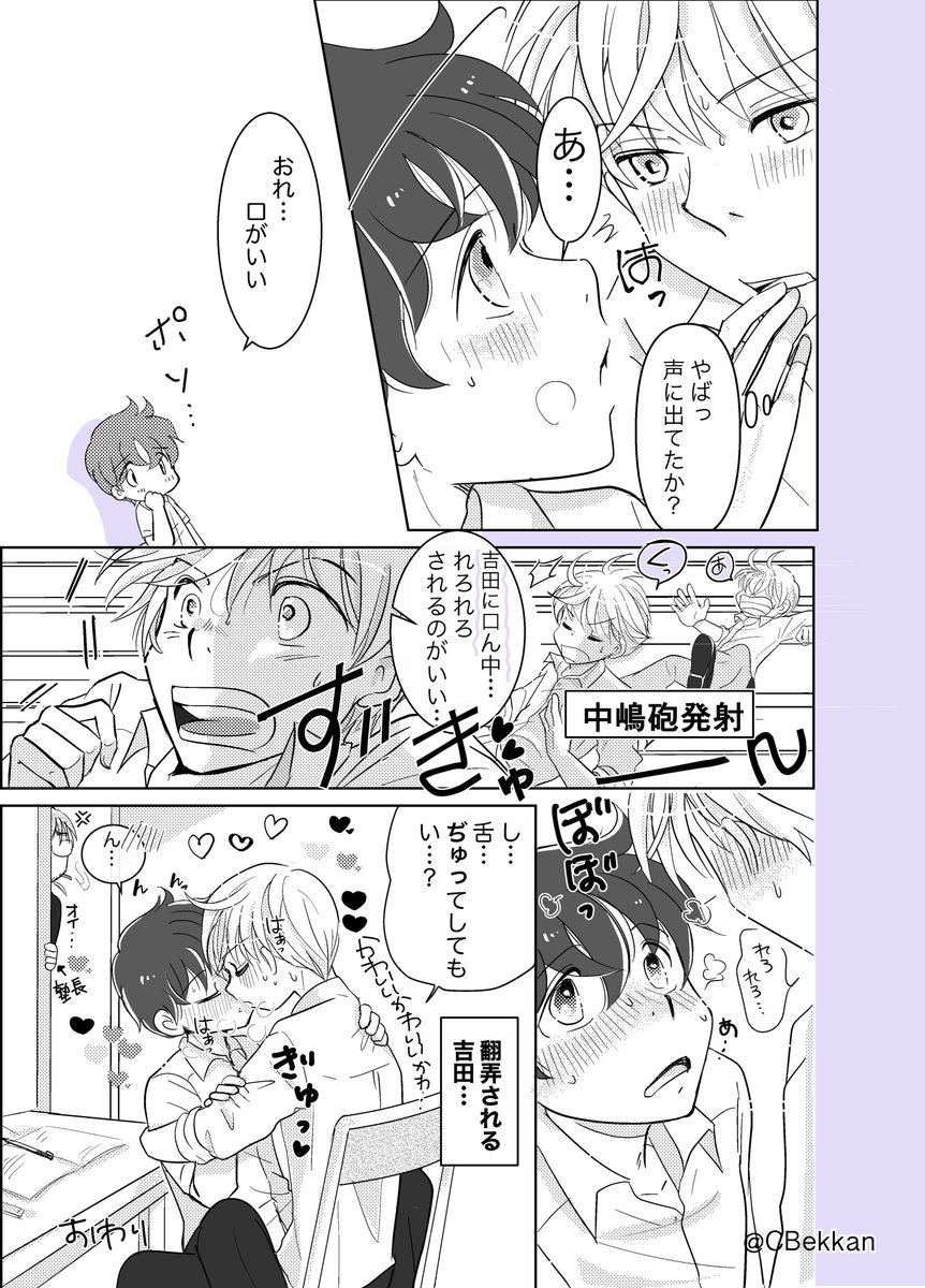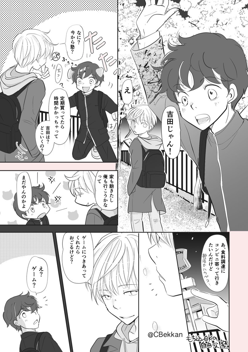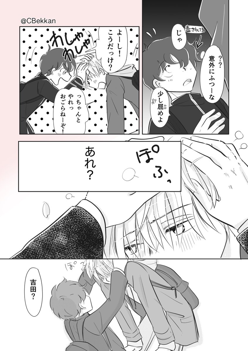 【番外編:付き合ってからのなかよしくん漫画⑩】 おはようございます。 約2か月ぶりのなかよしくん漫画💕 お暇時間に読んでいただけましたら💕 全2ページ。リプ欄に続く😆 『悩める吉田くん〜吉田くんの葛藤〜』(1/2) #漫画が読めるハッシュタグ #創作BL #放課後男子