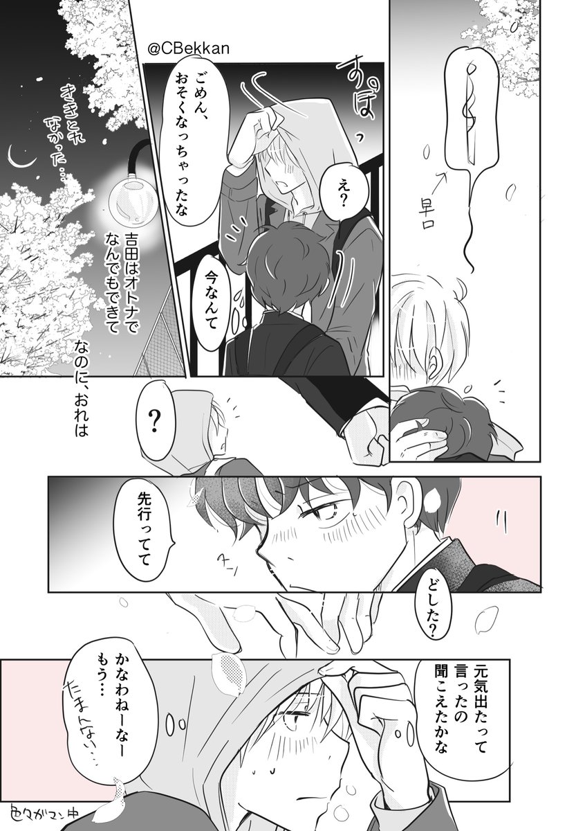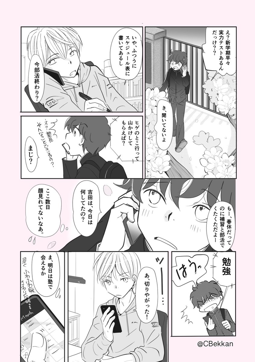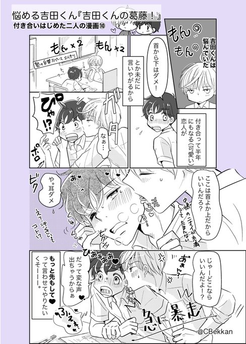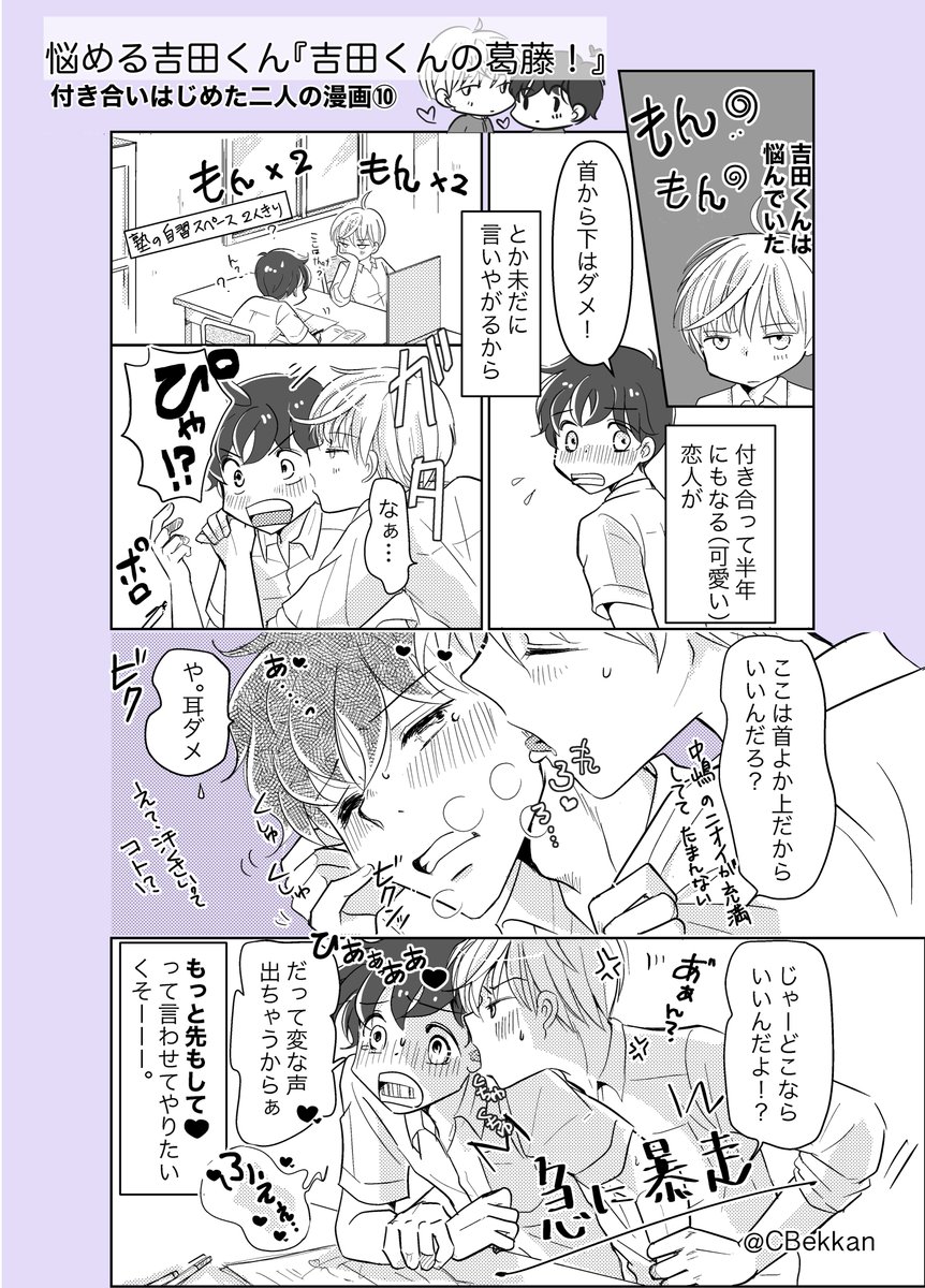 【番外編:付き合ってからのなかよしくん漫画⑩】 おはようございます。 約2か月ぶりのなかよしくん漫画💕 お暇時間に読んでいただけましたら💕 全2ページ。リプ欄に続く😆 『悩める吉田くん〜吉田くんの葛藤〜』(1/2) #漫画が読めるハッシュタグ #創作BL #放課後男子
