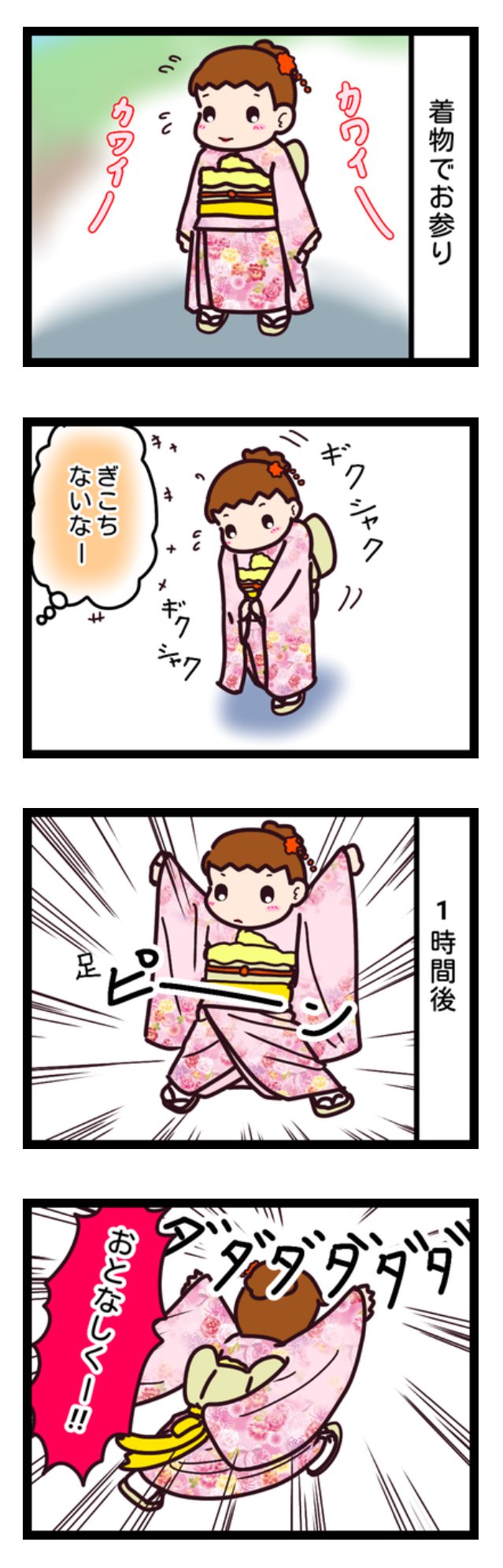 土日は七五三のお子さんを見かけますね。 ウチも着物でお参りしたけど終盤はぴょんぴょん飛び跳ねて着崩れどころじゃなくなりました(笑) #漫画が読めるハッシュタグ #漫画 #ASD #自閉症スペクトラム #七五三 #数え年