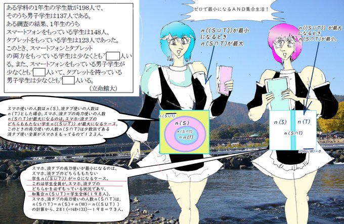 #みんなで楽しむTwitter展覧会 $picrt #oc #ArtistOnTwitter #勉強垢 #数学 スマホ使いの人数はn(S)、液タブ使いの人数はn(T)とした場合、スマホ、液タブの両刀使いの人数n(S∩T)が最大になるのは、スマホ・液タブのどちらももつ学生n((S∪T)) が最小になるケースになります。
