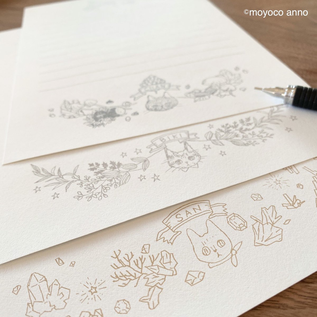 #安野モヨコ が描く ねこの #三匹ちゃん の 新しいグッズもつくってます❗️ サン、ビキ、チャン。 三種の便箋の 印刷サンプルが届きました🌟 それぞれイラストも色も違います。 鉱石や葉っぱ、どんぐり、、 モチーフもかわいい。。 #文具女子博2021 で 販売しますよ〜🐈🐈⬛🐈 (スタッフ珠)