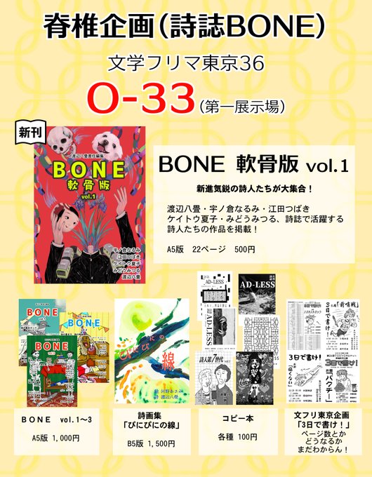 【お知らせ】 5/21(日)文学フリマ東京36に出展します! 新刊は「BONE 軟骨版」vol.1! 雑誌で活躍する詩人たちの作品を多数掲載しています さらに特別企画「3日で書け!」も参加者募集中! 参加費無料、誰でもウェルカムです! O-33「脊椎企画」に来て~~~ #文学フリマ #文学フリマ東京36