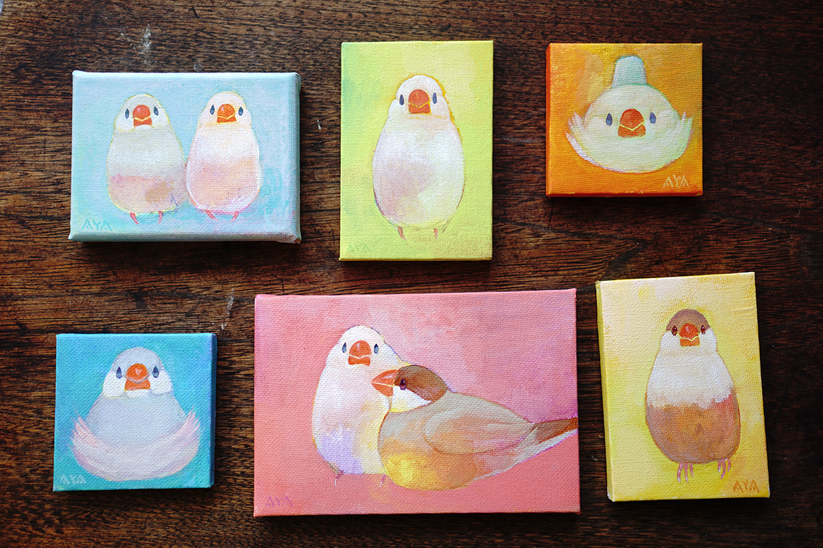 「文鳥部屋の昼と夜」両面アクリルキーホルダー 正面からのお写真はこんな感じです! さて、文鳥ちゃんは計何羽でしょう〜🤭 (パーカーとかカレンダーとかの絵は除く) #文鳥まつり2021 #文鳥まつり