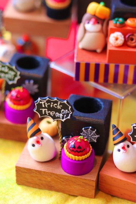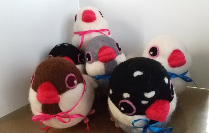 #文鳥まつり2021 #羊毛フェルト 親馬鹿倶楽部 最初に出来てた羊毛フェルトぬいぐるみ6羽の文鳥さん達 です。やっとおリボン着けられました。今回はお腹に鈴を仕込んだけど余り気持ちよく鳴らない。密封すぎたか💦良い所はうるさく無いです。