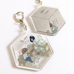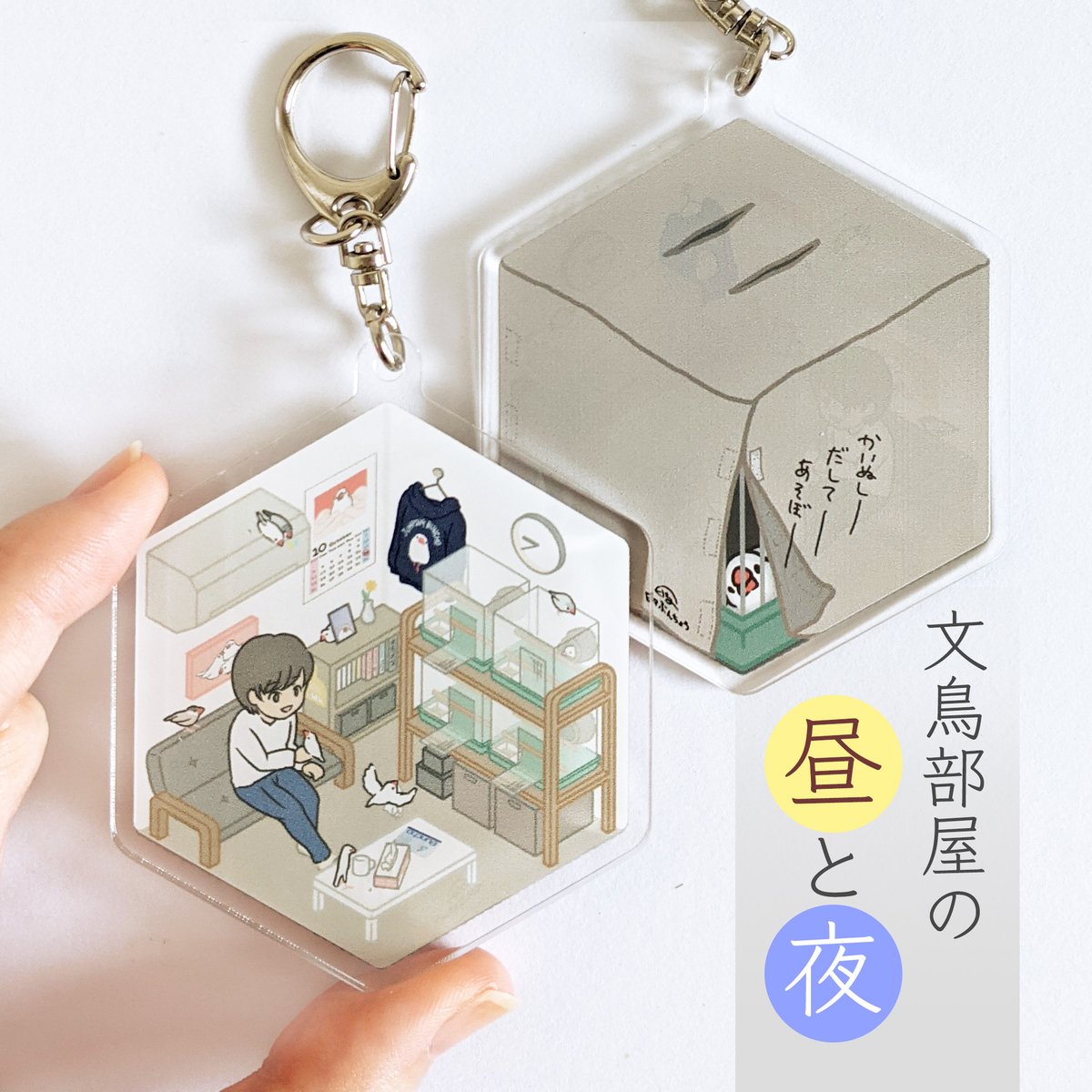「文鳥部屋の昼と夜」両面アクリルキーホルダー 正面からのお写真はこんな感じです! さて、文鳥ちゃんは計何羽でしょう〜🤭 (パーカーとかカレンダーとかの絵は除く) #文鳥まつり2021 #文鳥まつり