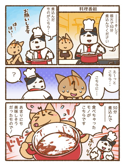 ドレミファにゃんのすけ 「料理番組」 特番希望 キューピー24時間クッキング! #漫画が読めるハッシュタグ #ゆるいイラスト #料理番組 #料理 #煮込み料理 #キユーピー3分クッキング #ハチワレ #にゃんのすけ