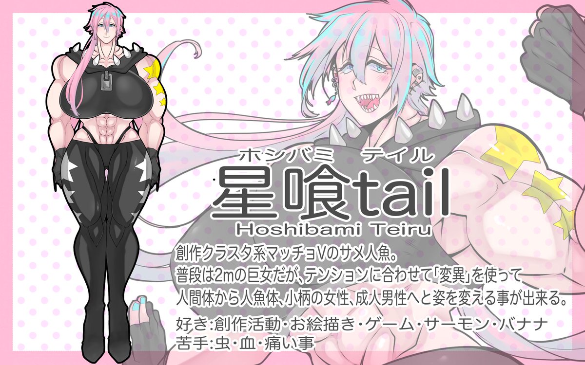 サメで筋肉ムキムキマッチョの2mの巨女で魂も女子の 星喰tail(ほしばみ ている)でございます! 好きな物には猪突猛進気味だけど 絵も描けちゃってLive2DのV身体も作れる つよつよセルフ受肉勢です!🦈💕 ゲーム実況の動画も作ってます! #新たなVtuberを見つけたい