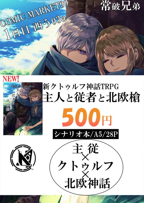 【C99お品書き】 12/30(木)1日目西う03a「常破兄弟」 新クトゥルフ神話TRPGシナリオになります。 よろしくお願いします! boothでも配布中! aikazu-zyouha.booth.pm #C99 #C99お品書き #新クトゥルフ神話TRPG