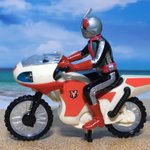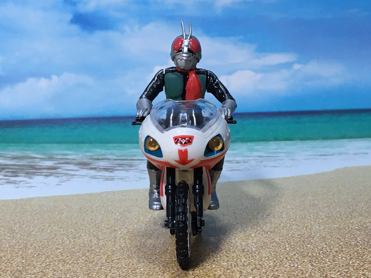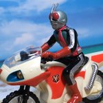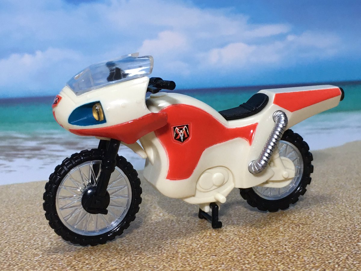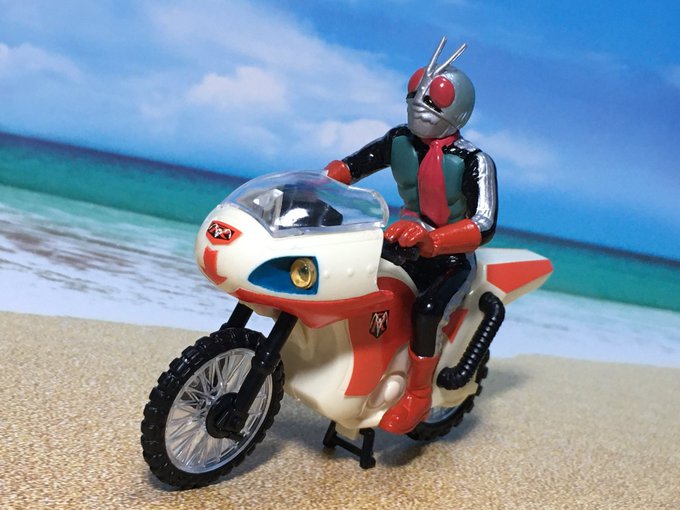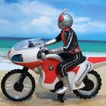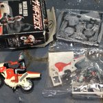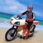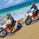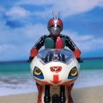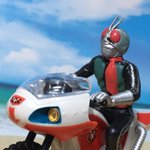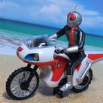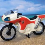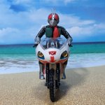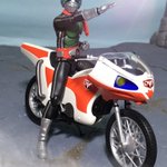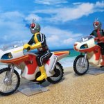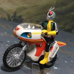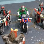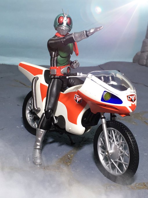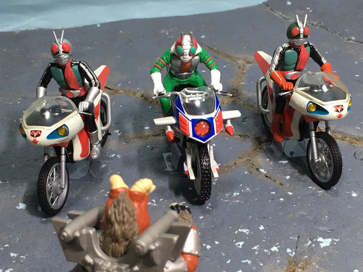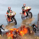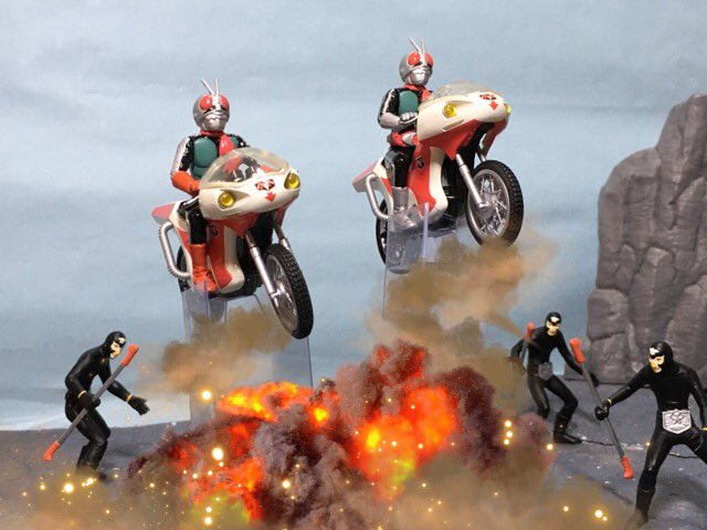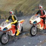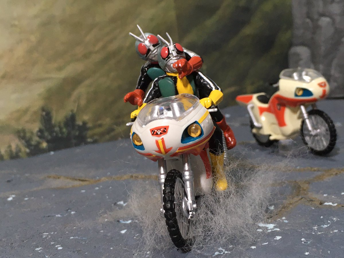 #夜のフィギュア撮影会 お題『斬』 風を斬って走るサイクロン号・・と思いきや、ニセ仮面ライダー!?2号が飛び乗って偽サイクロン号を破壊! #ショッカーライダー #仮面ライダー #仮面ライダー2号 #サイクロン号 #新サイクロン号 #ザ・ライダーマシン #オモ写