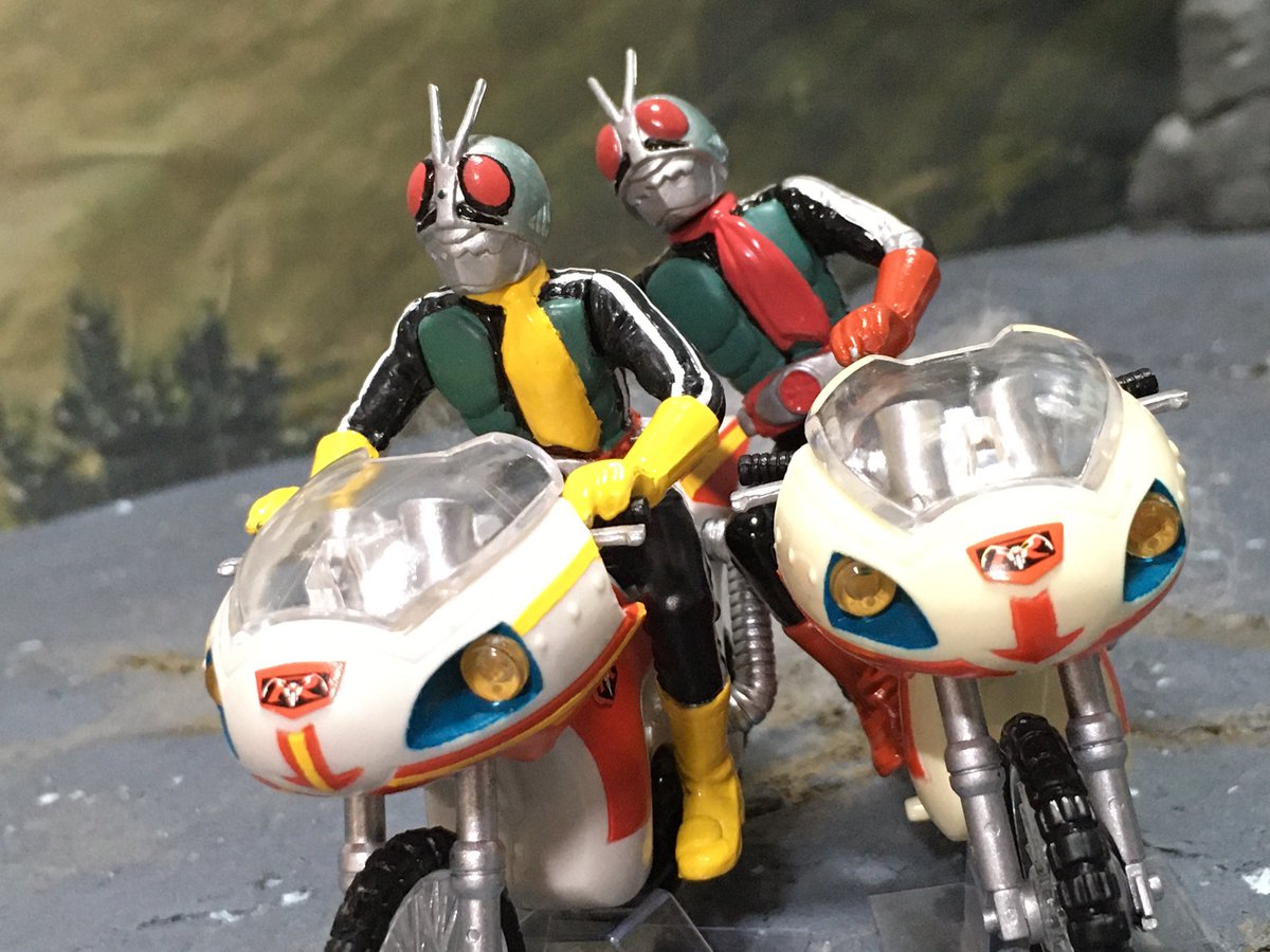 #夜のフィギュア撮影会 お題『音』 エンジン音を響かせて大ジャンプを決めるダブルライダー! #仮面ライダー #仮面ライダー新1号 #仮面ライダー新2号 #新サイクロン号 #メタルメカコレクション #ザ・ライダーマシン #オモ写