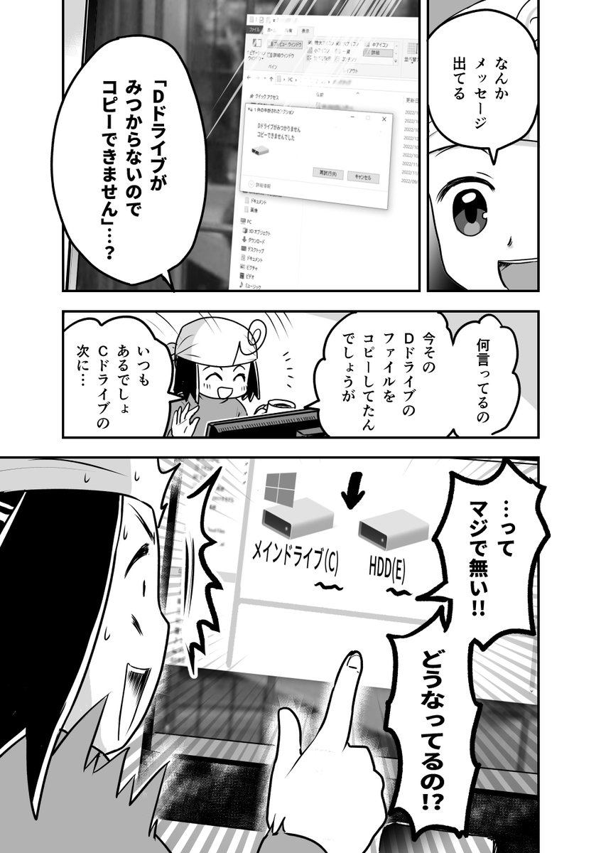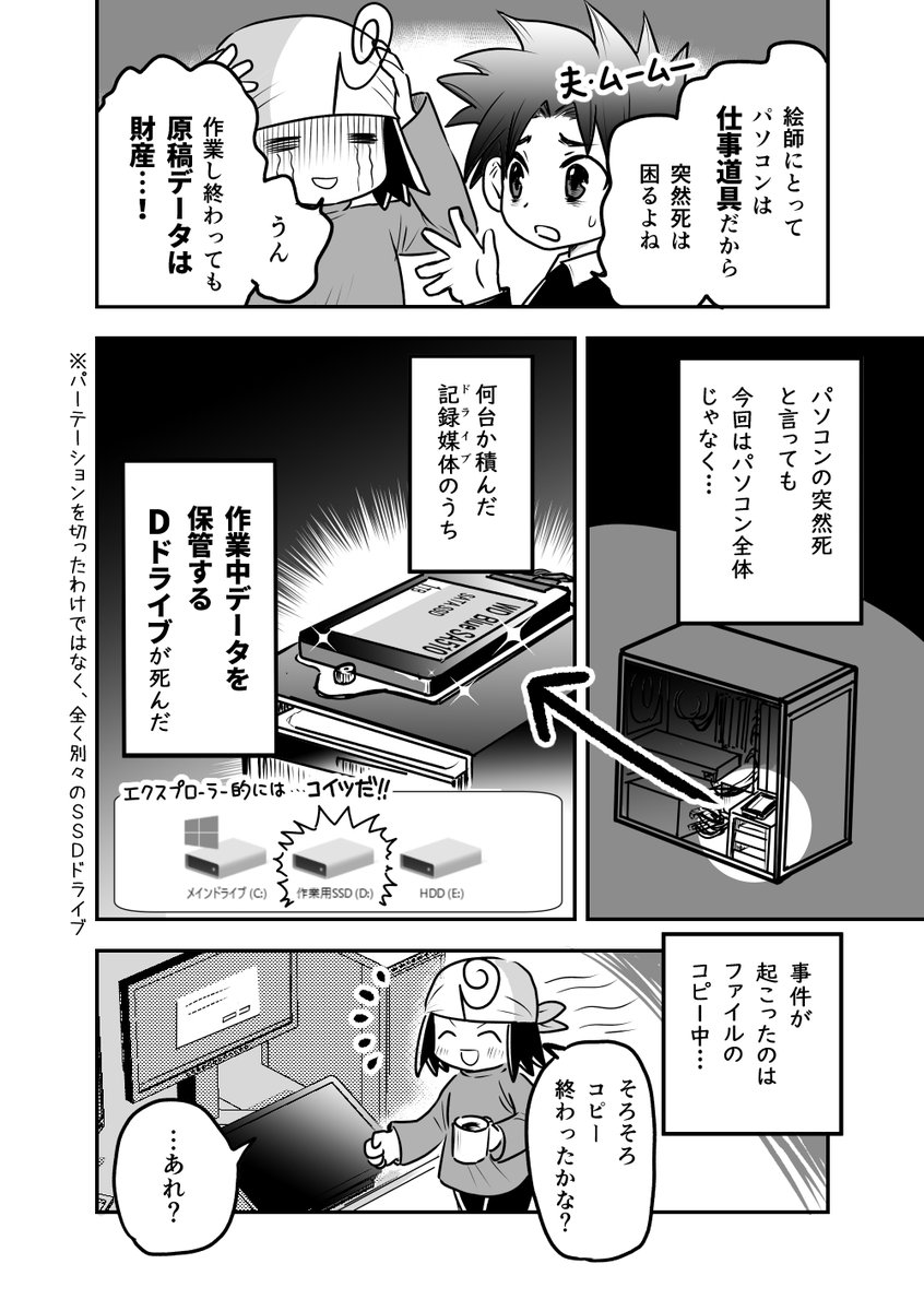冬コミ新刊のパソコントラブル同人誌よりサンプル4P 突然ドライブが死んでしまったらどうする!? 蘇生方法や予防のコツ等ノウハウ混じりの体験談漫画 書店の予約通販も受付中、遠方の方はそちらもご利用ください~ とらec.toranoana.jp/tora_r/ec/item… メロンmelonbooks.co.jp/detail/detail.… #C101 #新刊情報