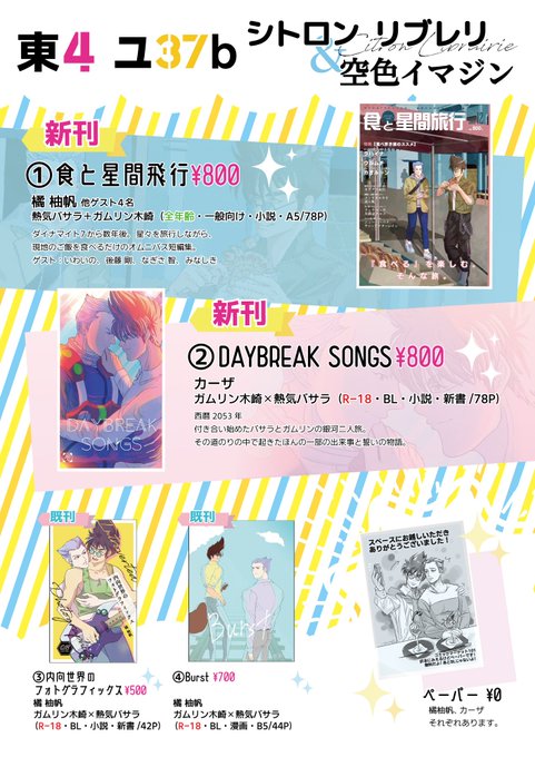 冬コミ新刊のサンプルを上げました✨ 『食と星間旅行』 ただ熱気さんと木崎くんが星々を旅しながらご飯を食べているだけのグルメ評論のような本で、ゲスト様4名をお迎えした計7話のオムニバス形式です。 pixiv.net/artworks/10382… #コミックマーケット101 #新刊情報