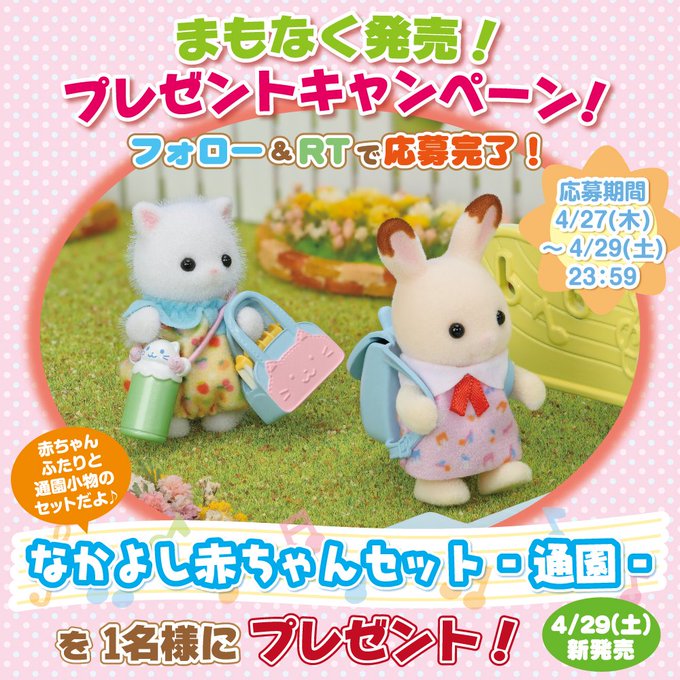 🌞まもなく発売!プレゼントキャンペーン🌞 このアカウントをフォロー&RTで応募完了! 「なかよし赤ちゃんセット-通園-」(4/29(土)発売)を抽選で1名様にプレゼント🎁 4/29(土)23:59〆切 #シルバニアファミリー #シルバニア #ほいくえん #通園 #シルバニア赤ちゃん #新商品