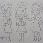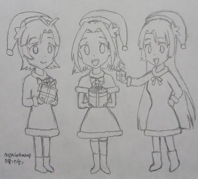 サンタさんな新宿3人娘描きましたー!(ラフ)🐈️ 玄関開けたら 新宿3人娘がやって来た!(豪華) 「メリークリスマス!🎉」 イラスト、後日に清書して色塗って、また投稿しますね! #新宿西口たん #新東たん #しんじゅくたん #ビッカメ娘 ( #ナイセン ) #ビッカメ娘を描き隊 #絵描きさんと繋がりたい