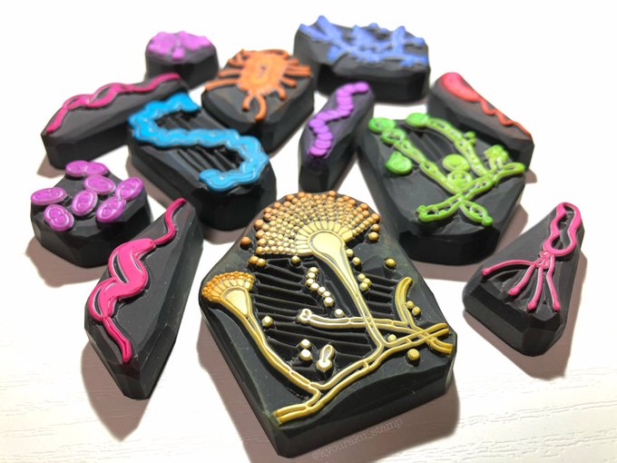 #新年になったのでフォロワーさんに自己紹介しようぜ 元生物学専攻の判子作家 京楽堂です 研究していたバクテリアの魅力をもっと伝えたくて消しゴムはんこで表現してみました🦠 生物の魅力や面白さが詰まった作品をめざしています! #消しゴムはんこ