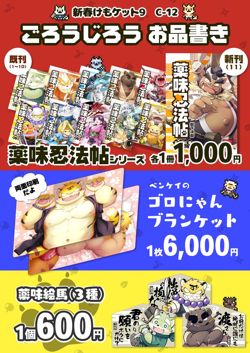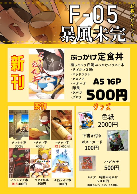 新春けもケット9のお品書きです F-05 暴風未完 新刊サンプルは固定にあります 既刊のサンプルはこれのキャプションからpixiv.net/artworks/10453… よろしくお願いいたします!! #新春けもケット9
