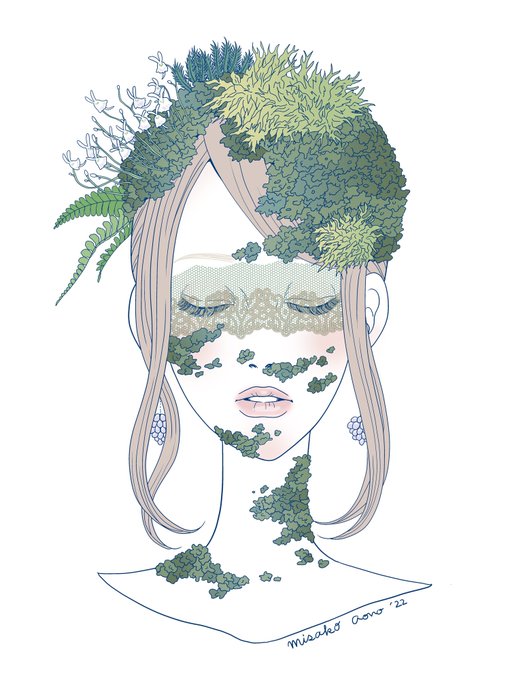 2人展に出した作品⑳Miss Moss 幡ヶ谷仮面展2022に出品した、顔に苔が生えてくる女の漫画をZineにした際の表紙画。同時に出品していた立体の仮面のデザインを取り入れました。 #新春芸術祭2023 #イラスト #イラスト好きな人と繋がりたい #冬の創作クラスタフォロー祭り #新春私の作品広まれ祭り