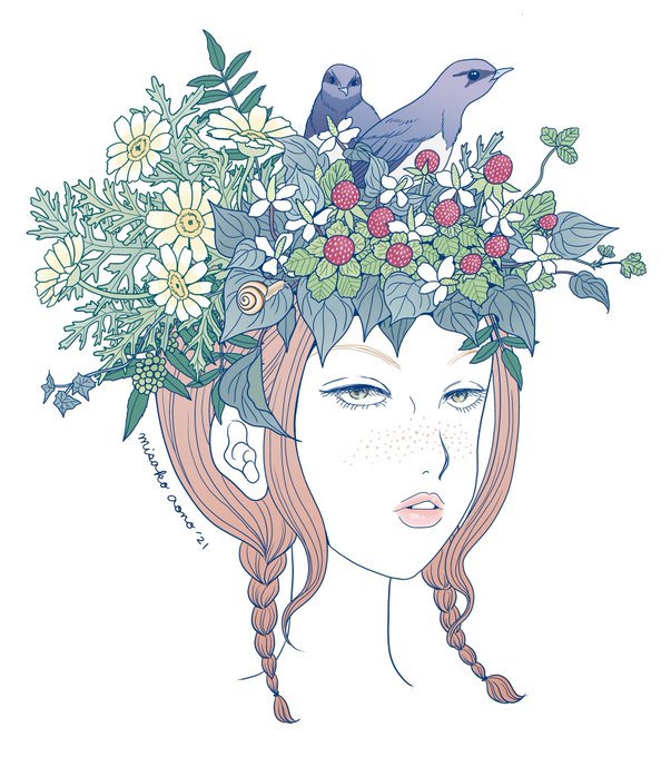 2人展に出した作品⑫Fish Mint Girl ドクダミの花の季節、毎日のように道端のドクダミを見てたら描きたくなった作品。同じ時期が旬のヘビイチゴと山椒も添えて。ドクダミチンキを作った年でもありました。2021年作 #新春芸術祭2023 #イラスト #冬の創作クラスタフォロー祭り #新春私の作品広まれ祭り