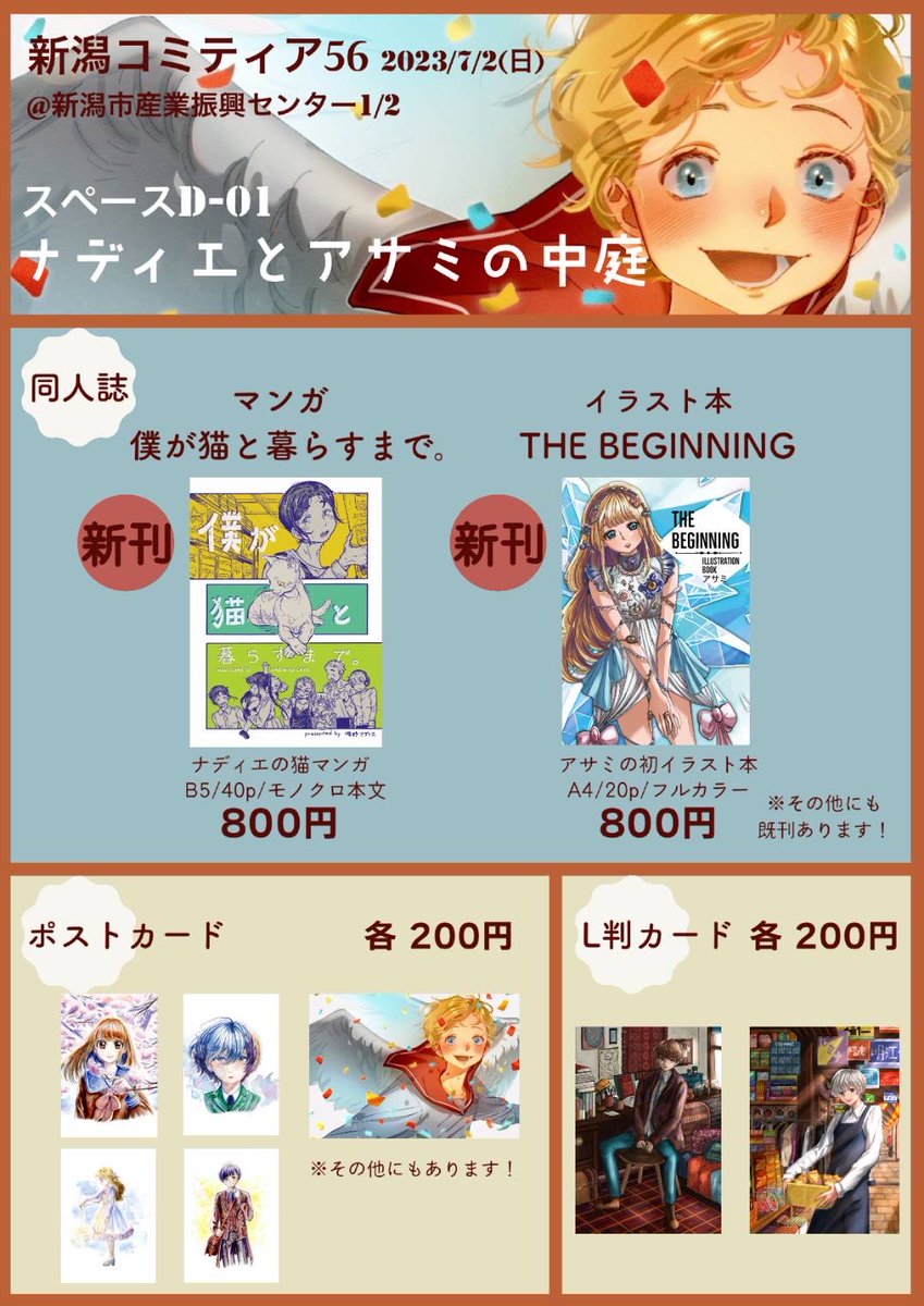 【告知】 【#新潟コミティア56】に、アサミさん(@asami_1620)と一緒に参加します! サークル名 【ナディエとアサミの中庭】 スペース 【D-01】 日付 7月2日(日) 会場 新潟市産業振興センター 今回は、漫画新刊があります✨サンプルは、こちら→【pixiv.net/artworks/10933…】