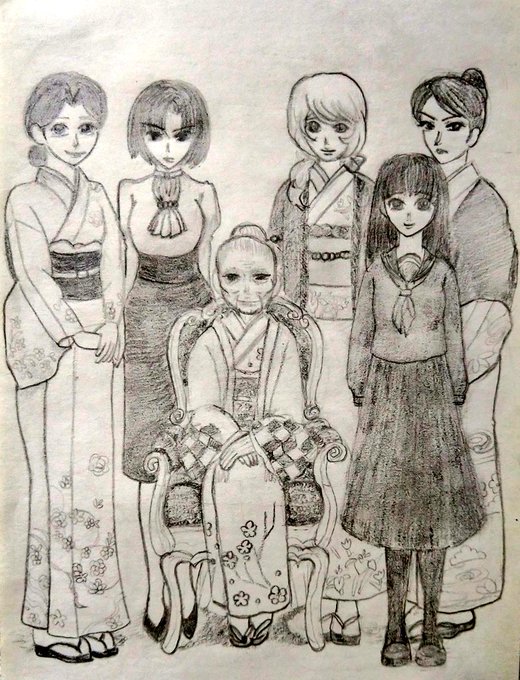 ある女系一族の肖像 「女系」「一族」しかも「美形」。 誰が読んでも美味しい要素が多過ぎる✨ 老いも若きもそれぞれの特徴が 出るように描いてみた。 1人はみんなの想像にお任せする❗ #イラスト #創作 #鉛筆画 #二次創作 #新絡婦の理 #イラスト好きさんと繋がりたい #絵描きさんと繋がりたい