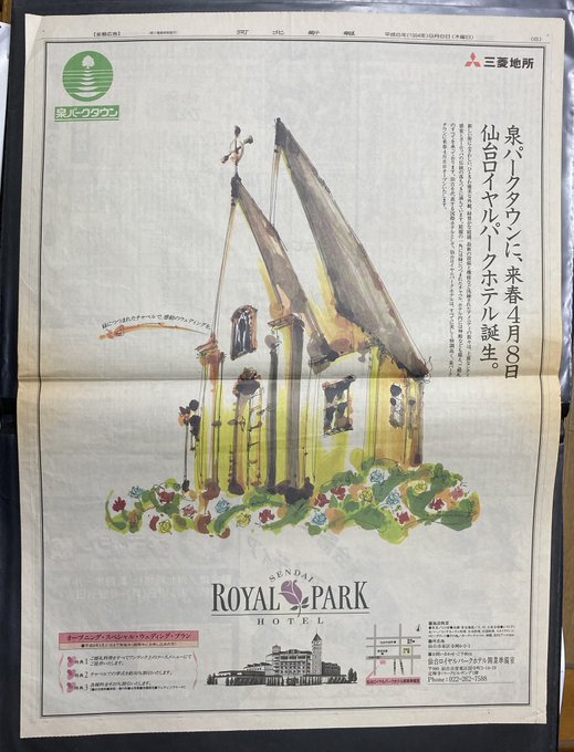古い仕事関係の刷り上がりを廃棄と保管に分別中 イラストを担当した、仙台ロイヤルパークホテルグランドオープン全面広告が出てきた。 教会をモチーフに描いた、30年も前の仕事です。黄ばんでるけど、これはやっぱりアーカイブ。 #ロイヤルパークホテル #イラスト #新聞広告