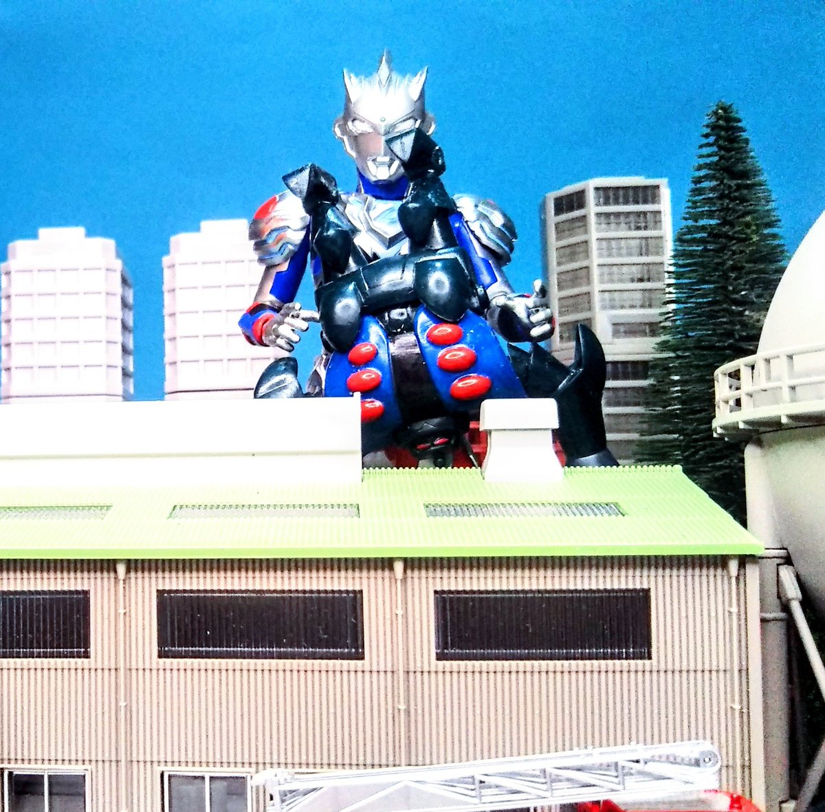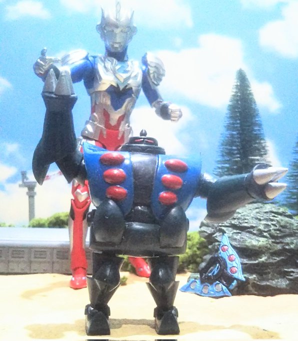 #夜のフィギュア撮影会 お題「赤・緑・青」(既出) ウルトラマンZに、手足が生えて逃げ出したゼットライザーだと勘違いされ、追いかけられる、アンドロ軍団のツメロボット・・・ #ウルトラマンゼット #新造人間キャシャーン