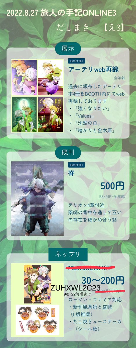 すみません、ネップリ絵の差替えが出たので改めて告知です😇 8/27 #旅人の手記ONLINE3 【え3】だしまきのお品書きです アーテリweb再録・既刊とネップリでステッカー等ございます 当日はエアスケブも受けますのでお気軽に! #旅人の手記ONLINE3_お品書き